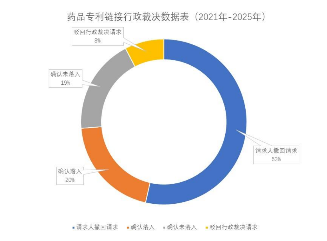 截至2025年11月14日,国家知识产权局公开的药品专利行政裁决共183份。其中,超过一半(98件)的案件由请求人主动撤回。在作出实质裁决的案件中,有37件被认定落入专利保护范围,占比约20.2%;34件被认定未落入专利保护范围,占比约18.6%;14件因不符合法定条件被裁定驳回请求,占比约7.7%。