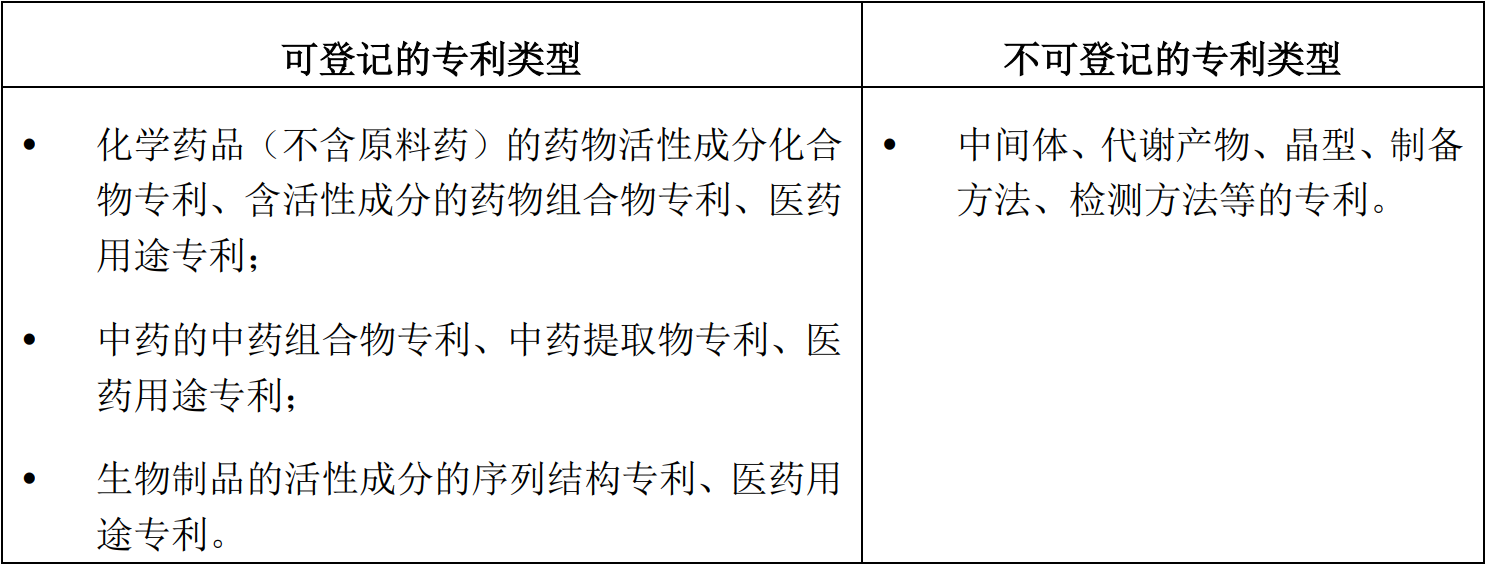药品上市许可持有人需在上市药品专利信息登记平台登记在中国境内注册上市的药品相关专利信息。其中,“相关专利信息”需要满足两个条件,一是需为已经在中国上市的原研药相对应地登记在专利信息登记平台的专利 ;二是原研药本身的技术方案需落入登记专利权利要求的保护范围之内 。此外,登记专利需在《实施办法》规定的可登记的专利类型范围内。