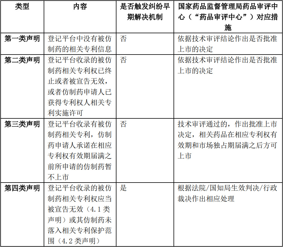 《实施办法》第六条及第十二条规定,化学仿制药、中药同名同方药、生物类似药申请人应在提交药品上市许可申请时,对照已在中国上市药品专利信息登记平台公开的专利信息,针对被仿制药每一件相关的药品专利作出声明,具体如下: