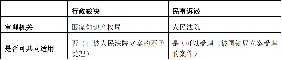 需要注意的是,《实施办法》里明确规定了国家知识产权局受理药品专利纠纷行政裁决的条件之一是人民法院此前未就该药品专利纠纷立案,而《药品专利民事案件司法解释》则规定了,当事人以国务院专利行政部门已经受理专利法第七十六条所称行政裁决请求为由,主张不应当受理专利法第七十六条所称诉讼或者申请中止诉讼的,人民法院不予支持。