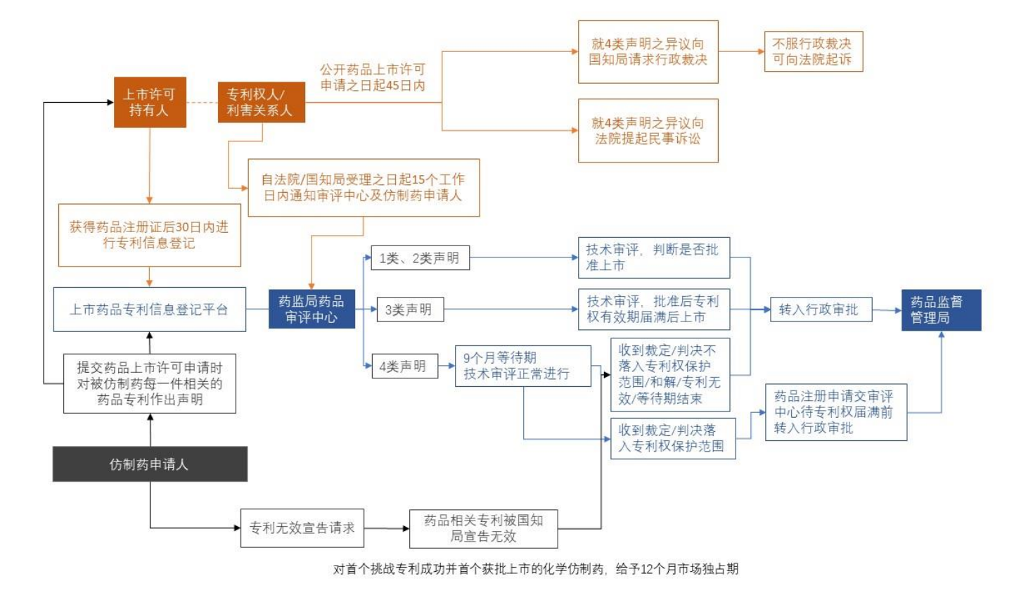 该制度要求仿制药申请人在提交上市申请时,就涉及的专利做出声明。如存在争议,原研药专利权人或利害关系人可以在审评阶段提起民事诉讼或行政裁决程序,要求判定仿制药是否落入其专利保护范围。药监部门则可在法院判决或行政裁决作出前,暂停审批该仿制药的上市许可。